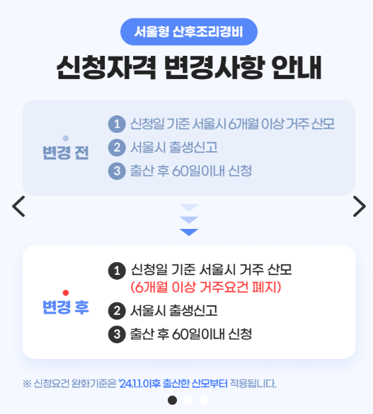 - 신청일 기준 서울시 거주 (2024년 1월 1일 이후 출산산모부터 6개월이상 거주기간 미적용)