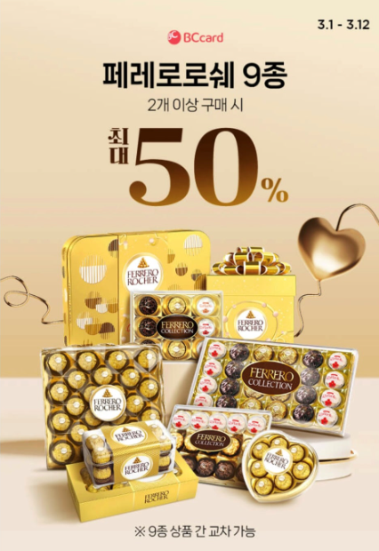 1) 페레로로쉐 9종 2개 이상 구매시 BC카드로 결제시 최대 50% 할인 (1회 할인한동 15,000원)